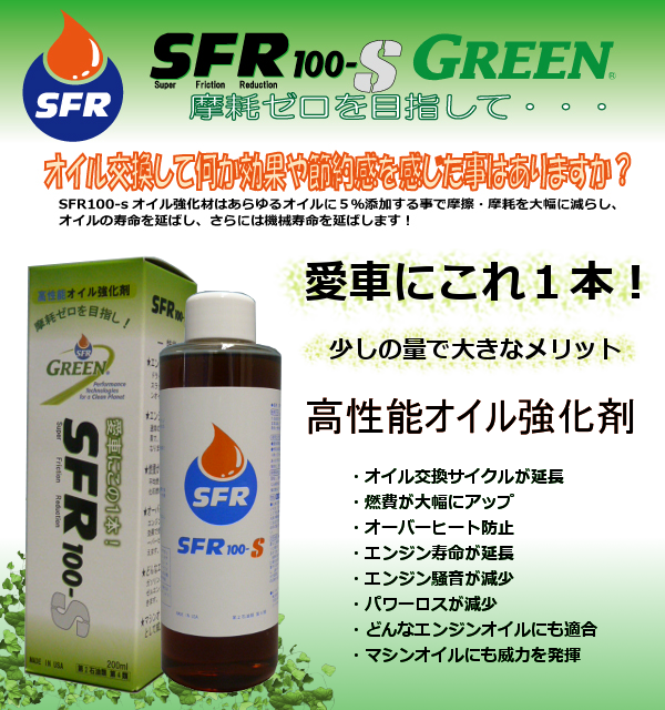 SFR100-S 高性能オイル強化剤SFR100-Sオイル強化剤は、化学合成油ベースの添加剤で、ASTMD-2783四極荷重テストにおいて、800kgから1000kgの荷重に耐えうる潤滑能力を備えています。自動車や重機などのあらゆる機械・エンジンにSFR100-Sを添加する事で、その能力と効果を最大限に引き出し、更に機械寿命の延長と最高の能力を維持し続けます。 |